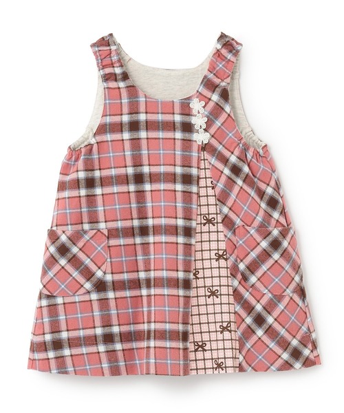 リバーシブル仕様のジャンパースカート。表面は、先染チェックをベースに、バイヤス使いや、別のチェック×リボン柄で切り替えた、凝ったデザインです。左胸のレースの花モチーフで、さりげなく可愛らしさをプラス。裏面は、やわらかなカットソー素材に、同じチェックを使ったmimiちゃんのアップリケと裾からのぞくチェックがアクセントに。異素材の組み合わせで、気分やシーンに合わせて着回しやすく、軽やかで快適な着心地も魅力です。