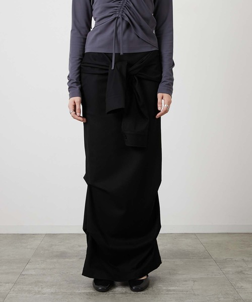 <fabric> マットで落ち着いた質感の生地を使用。適度なハリ感がありつつ、柔らかく体のラインに馴染む素材。 オールシーズンご着用いただけます。 <style> シャツを腰に巻いたような、デザインのIラインロングスカート。 膝下からは立体的なドレープが施され、後ろにはスリットがあります。 スタイルアップ効果もありながら、抜け感のあるカジュアルモードな雰囲気を叶えてくれます。 ウエスト部のシャツの袖を一周巻きつけて結ぶことでウエストのフィット感や丈の印象を自在に調整いただけます。 ワンサイズながら、体型やスタイルに合わせて着こなせるのが魅力です。 前後どちらでも結んでいただけます。 【led.tokyo/レッドトーキョー】 TOKYOから生まれるファッション・アート・ 音楽・映画・漫画をはじめとした様々なカルチャーからのインスピレーションをコレクションに落とし込んでいます。 TOKYO的なファッション・カルチャーの ミックスアップ・編集感覚はそれぞれのアイテムに落とし込まれ、様々なスタイリングを生み出すことができます。 袖が取り外せたり、前・後ろで着られたり、 ひとつのアイテムから様々な着こなし、無限のスタイリングアイディアが生まれます。 ブランドが考えるルックブック的なスタイルではなく、着る人それぞれが自分だけのスタイルを生み出していく。 それが『led.tokyo』の考えです。 【お買い物をよりお楽しみいただくために】 ■商品のお気に入り登録(ハートマークをクリック) 完売カラーの再入荷通知や、在庫ラスト1点の通知、セールの通知を受け取ることができます。 ■ブランドのお気に入り登録 新商品がUPされたり売り切れ商品が再入荷したときなど、いち早くブランドのお得な情報を受け取ることができます。 是非ご利用頂き、お買い物をお楽しみください。