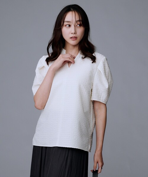 【デザイン】 ドライタッチで涼し気なサッカー素材を使用し、すっきりとした衿元のスキッパーブラウス。 コクーン型のフォルムスリーブで二の腕をカバーしつつ女性らしい印象に。 裾にはスリットを入れ、フロントタックインしやすく、着こなしやすい一枚です。 【素材感】 糸の収縮差で細やかな凹凸感とストレッチを出した素材。 さらっとドライなタッチで非常に清涼感があり、皮膚との接点が少ないため快適な着心地感を提供します。 ※吸水速乾機能付き 【着こなしポイント】 スカートにもパンツにも合わせやすい一枚です。 スカートにはインして着ていただくとよりすっきりとした印象です。 【仕様】 ※この製品は、吸水速乾効果のある素材を使用しています。この効果は永久的ではありません。 ※照明の関係により、実際よりも色味が違って見える場合があります。また、パソコン・スマートフォンなどの環境により、若干製品と画像のカラーが異なる場合もございます。 モデル情報:身長163cm B80 W59 H82 着用サイズ:02(M) 店舗へのお問い合わせ商品番号:153-83330 ●製品寸法: 00(XS):着丈57cm B94cm 袖丈28cm 肩幅38cm 02(M):着丈60cm B101cm 袖丈29cm 肩幅40cm 04(2LT):着丈62cm B107cm 袖丈30cm 肩幅42cm 44(3L):着丈63cm B115cm 袖丈31cm 肩幅43cm 48(5L):着丈65cm B123cm 袖丈32cm 肩幅44cm 50(6L):着丈66cm B127cm 袖丈32cm 肩幅45cm 備考: