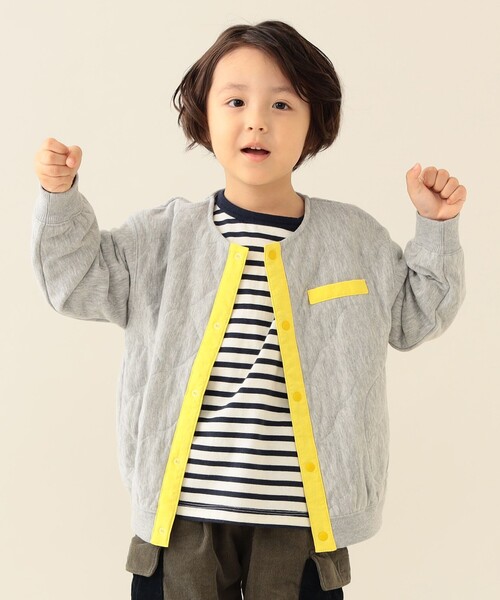 季節の変わり目にサッと羽織れる一枚 季節の変わり目にぴったりなキルティング加工が施された、軽やかな印象ジャケット。 フロントボタンを閉じても開けても様になるデザインで、幅広いコーディネートが楽しめます。 お子様でも簡単に着脱できるよう、フロントはスナップボタン仕様です。 身幅にゆとりを持たせた、リラックス感のあるシルエットは、薄手のスウェットやカットソーの上に羽織ってもごわつきにくく、快適に着用いただけます。 程よい丈感で、様々なボトムスと相性が良く、バランス良く着こなせます。 ■ケア方法 水洗い可 (詳細は商品についている品質表示ラベルをご覧ください) 生地の厚さ:普通 伸縮性:あり 裏地:なし ※サイズによりブランドネームタグのカラーが異なります。 90~120:オフホワイト 130~:ネイビー 【対象年齢:およそ2~11歳】 Model:H105.5(cm)Size:110 ※光の当たり具合やパソコンなどの閲覧環境によって実際の色味と異なって見える場合がございます。予めご了承ください。 ※商品の色味は商品単体で撮影した画像をご参照ください。 BEAMS mini / ビームス ミニ “BEAMSの安心感や信頼をこども服に” 創業から時代を越えて多くの方に共感いただける、オリジナルのこども服を展開。 元気なカラーリングやプレイフルなデザイン、ベーシックアイテムにファッション性を加えた着心地の良い一着をお届け。誰からも愛される、日常を彩るファッションを提案します。