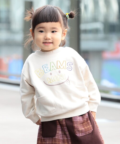 笑顔をプラス!気分が上がるお気に入り ポップなロゴと、胸元のポケットが目を引くスウェットです。カラフルなスマイルロゴ刺繍が、お子様の笑顔をさらに引き立てます。 立体的なポケットは配色デザインになっており、さりげないアクセントに。遊び心あふれるデザインで、おしゃれキッズの心をくすぐります。 首元と袖、裾はリブ仕様で、元気いっぱいのお子様の動きを妨げません。程よい丈感で、どんなボトムスともバランス良くコーディネートが楽しめます。 ■ケア方法 水洗い可 (詳細は商品についている品質表示ラベルをご覧ください) 生地の厚さ:普通 伸縮性:あり 裏地:なし ※サイズによりブランドネームタグのカラーが異なります。 90~120:オフホワイト 130~:ネイビー 【対象年齢:およそ2~10歳】 TOP GREY・NAVY Model:H105.5(cm)Size:110 IVORY Model:H82(cm)Size:90 LILAC Model:H78(cm)Size:90 LILAC Model:H115(cm)Size:110 ※光の当たり具合やパソコンなどの閲覧環境によって実際の色味と異なって見える場合がございます。予めご了承ください。 ※商品の色味は商品単体で撮影した画像をご参照ください。 BEAMS mini / ビームス ミニ “BEAMSの安心感や信頼をこども服に” 創業から時代を越えて多くの方に共感いただける、オリジナルのこども服を展開。 元気なカラーリングやプレイフルなデザイン、ベーシックアイテムにファッション性を加えた着心地の良い一着をお届け。誰からも愛される、日常を彩るファッションを提案します。