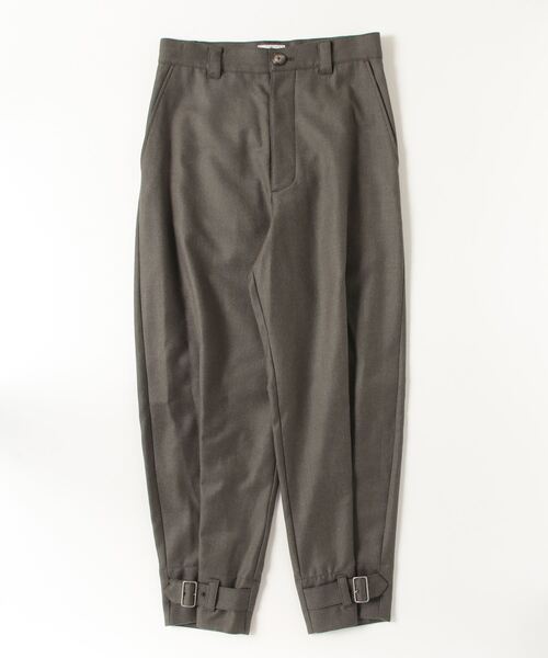 程よく艶やかで深みのあるオリーブカラーのウールを使用したHEM BELT SAMURAI TROUSERS。尾錠で絞ったバックスタイルが美しく、さらに裾をベルトで絞ることで360度どの角度から見てもシルエットの面白さを感じられる、珠玉のトラウザーです。