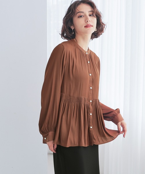 レディなペプラムシルエット 【デザイン】 たっぷりのギャザーととろみ素材が作る柔らかなドレープがフェミニンなデザイン。 シャーリング入りのウエスト切り替えからふんわり広がるシルエットと、ゆったりめの幅×ヒップまで隠れる丈感で気になる体型もカバー。 顔周りをすっきり見せるバンドカラー。 ゴールドボタンがアクセント。 【素材・機能】 環境にやさしい再生ポリエステルを使用した、落ち感のある滑らか素材。 【スタイル】 テーパードパンツと合わせたきれいめお仕事スタイルから、デニムと合わせたカジュアルスタイルまで幅広く活躍。 ブラウスとしてはもちろん、ボタンを開けてラフに羽織るのも◎ ※ウエスト部分ゴムシャーリング 品番:673-61-0069