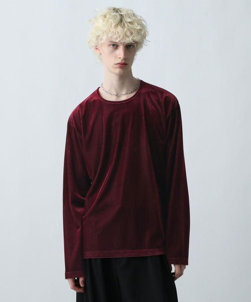 ーーー 程よい透け感と光沢感を持つベロア生地で色気のある印象に 凹凸のあるプリーツが存在感を出すラフな着心地のカットソー ーーー DESIGN 上品な印象のベロア生地を使用した、凹凸感のあるプリーツが存在感をプラスしてスタイリングのアクセントに。 首元の開き具合にこだわり、だらしなく見えないよう絶妙なバランスで首元を空けた抜け感と色気を演出するデザイン。アクセサリーも綺麗に見える空き具合で〇 袖回りや身幅にゆとりを持たせており、インナーとしても一枚着でも様になるシルエット。 落ち感がありスッキリと着用できるため、インナーとしてレイヤードしてもごわつかずに綺麗なシルエットを実現。 MATERIAL ポリエステルとポリウレタンを混紡した生地で、程よい落ち感とハリ感を両立しており綺麗なシルエットに仕上げます。 シワになりづらくお手入れも簡単〇軽やかな着用感のポリエステルと伸縮性のあるポリウレタンを掛け合わせる事でストレスフリーに着用できます。
