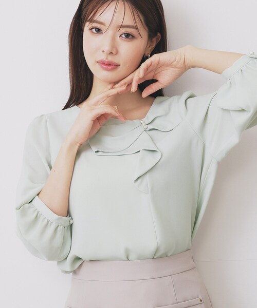 パール調が施されたリボン風フリルが華やかなブラウス【デザイン】・エレガントなパール調があしらわれたリボン風のフリルがアクセントの、洗練されたブラウス。・ふんわりとした七分袖が女性らしさを引き立て、上品なシルエットを演出します。・季節の変わり目などこれからのお季節におすすめの袖丈です。・バックスタイルには小さなパール調ボタンが施され、さりげないディテールが魅力的です。【素材】・軽やかで肌触りの良い素材が、快適な着心地を提供します。・イージーアイロン加工が施されており、忙しい日常でも安心。・洗濯機でのお手入れが可能で、手軽にケアできるのも嬉しいポイント。※照明の関係により、実際よりも色味が違って見える場合があります。また、パソコン・スマートフォンなどの環境により、若干製品と画像のカラーが異なる場合もございます。モデル情報:身長165cm B79 W58 H86 着用サイズ:38(M)店舗へのお問い合わせ商品番号:C58-83013●製品寸法:36(S):着丈53cm B92cm 袖丈48cm 肩幅31cm38(M):着丈53cm B94cm 袖丈49cm 肩幅31cm40(L):着丈54cm B96cm 袖丈50cm 肩幅32cm42(LL):着丈55cm B98cm 袖丈51cm 肩幅33cm備考: