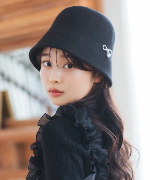 キラキラのリボンブローチがセットになったバケットハット 【Design/Styling】 ・秋冬シーズンに1つは持っておきたいウール素材のベーシックな帽子。 ・バケハらしく程よいツバの長さがあり、こなれ感を演出してくれます。 ・どんなスタイルのコーディネートにも合わせやすい優秀アイテム♪ ・内側でサイズ調節できる紐付き。 頭周り58cm