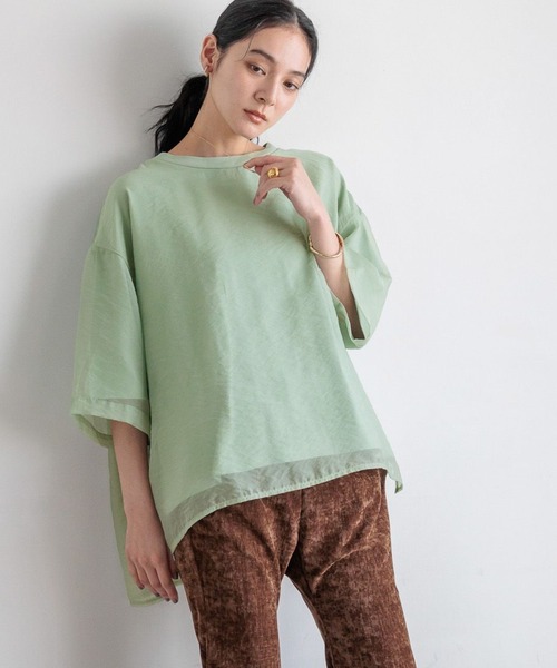 ■素材■ 軽くさらっとした風合いの天竺素材です。 別布に柔らかく繊細な透け感のオーガンジーを使用しております。 ■デザイン■ オーガンジーを重ねた着映えするTシャツアイテム。 ややゆるっとしたサイズ感がポイントです。 ■スタイリング■ お尻にかかる程度のミディ丈なのでバランス感を見ながら ワイドパンツやスカートと合わせていただくのがおすすめです .