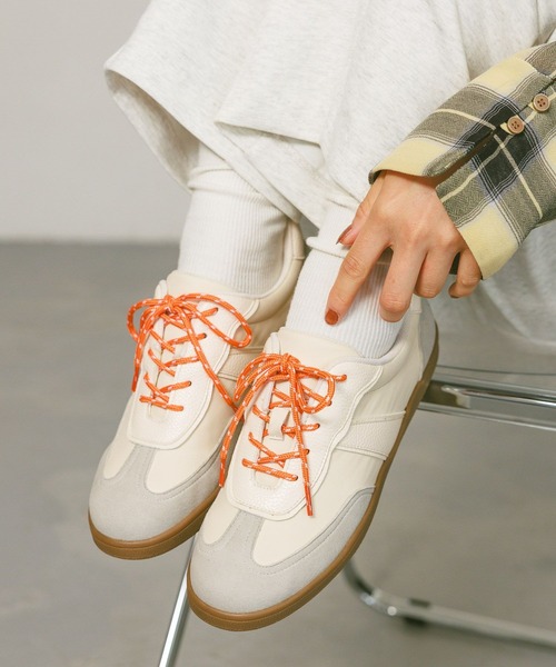 ーーー カラーのシューレースがポイントになる替え紐付きの2WAYスニーカー。 合皮×スエードのアッパーデザインに差し色のシューレースが映える一足。 カップインソールを採用しており、ホールド感があり歩きやすさも抜群です。 抗菌防臭と撥水加工付きと機能面も充実。 ーーー ※屋外での撮影画像は光の加減で実際の商品より明るく見えたり、風合いが異なって見える場合がございます。 商品の色味はスタジオ撮影の画像を参考にして下さい。 ------------------------------------- ≪お買い物をよりお楽しみいただくために≫ ◆商品のお気に入り登録(ハートマークをクリック) 完売カラーの再入荷通知や、完売間近の通知、セールの通知も受けることができます。 ◆ブランドのお気に入り登録 新商品や再入荷など、いち早くブランドのお得な情報を受け取ることができます。 -------------------------------------