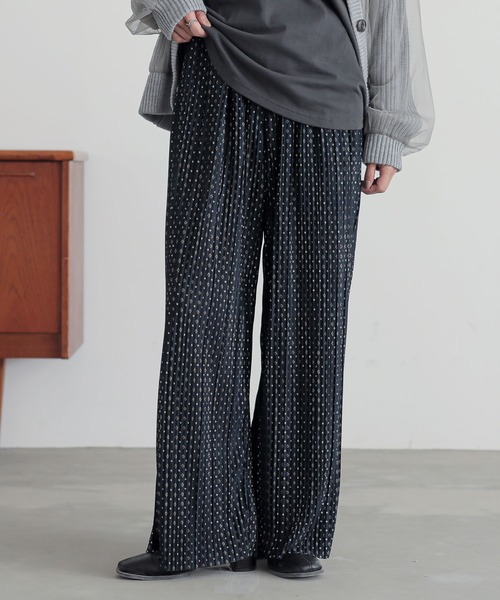 自分好みに合わせてカットできる。セルフカットプリーツワイドパンツが登場。 縦ラインを強調するプリーツが身体のラインを拾いにくく、すらりとした印象に。 縦長ラインですっきりシルエットを叶えてくれる。 自由に丈感を調整することができるセルフカットOKな生地を使用◎ 身長や好みに合わせたスタイリングをお楽しみいただけます。 落ち感のあるシルエットで、すっきりとした印象に。 ゆとりのあるワイド幅とプリーツ生地で、脚のラインを拾いにくい。 さらりと肌離れが良く◎ ポリエステル100%のプリーツ生地でストレスフリーな履き心地を叶えます。 目を惹く柄デザインと、着回し抜群のブラック無地の3カラー展開。 ウエストは楽ちんな総ゴム仕様。 調節可能な紐付きで、お好みのサイズに合わせてご着用いただけます。