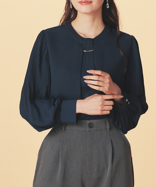 ボウタイ×プリーツで華やかに 【デザイン】 リボンを結ぶ必要のないシンプルなボウタイの上品なデザイン。 体のラインを拾いにくい、ゆったりめの幅と腰にかかる丈感。 細かなプリーツでボリュームを出したふんわり袖で、華奢見えを叶えながら華やかな印象に。 衿元をさりげなく飾るメタルパーツのアクセサリーは、シーンや気分に合わせて取り外し可能。 【素材・機能】 さらっと清涼感があり柔らかで着心地抜群の楊柳素材。 身頃には透けが気にならない裏地付き。 【スタイル】 テーパードパンツなどと合わせたきれいめオフィススタイルに大活躍。 デニムと合わせてカジュアルダウンさせるのも◎ ●裏地/身頃のみあり ※アクセサリー取り外し可(お洗濯の際は取り外してください) 品番:534-61-0119