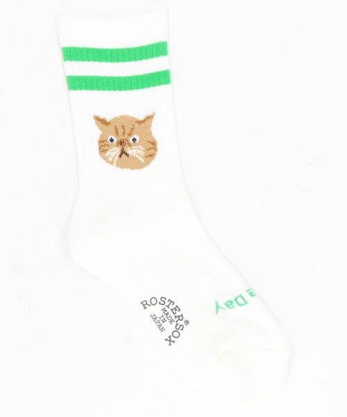 2025 Fall & Winter item人気なアニマル柄!キャットソックス登場●サイドにインパクトありな可愛い猫デザインがたまらない●Have A Nice Dayの文字が足元を見るたび気分が上がるデザイン●ラインの配色が可愛くトレンドな印象に●キャッチーなデザインでプレゼントにもぜひ!※メーカー品番:RS-464■シリーズ商品1385355700015:SAKE-SOCKS1385355700016:CAT-SOCKS1385355700017:DOG-SOCKS※こちらの商品は、弊社管理上のカラーを表記しております為、タグのカラー表記と異なる記載となっております。【サイト表記:タグ表記】オフホワイト:WHITE×GREYナチュラル:IVORY×ORANGEグリーン:WHITE×GREENネイビー:BLUE×NAVY---------------------------------------------------------お気に入り登録のオススメ▼商品のお気に入り登録▼再入荷、残り1点、セールなどの通知を受け取ることができます。▼ブランドのお気に入り登録▼新商品や再入荷、ショップのおすすめトピックスなど、いち早くブランドの情報を受け取ることができます。---------------------------------------------------------※掲載画像の商品の色味は、屋外や屋内の光の照射や角度により実物と色味が異なる場合がございます。また表示のサイズ感と実物は若干異なる場合もございますので、予めご了承ください。※着用、お取り扱いの際は、商品についている品質表示とアテンションタグを必ずご確認下さい。※こちらの商品はオンラインストア及び一部店舗での限定展開となります。【ROSTER SOX/ロスターソックス】roster(ロスター)は野球用語で「1軍登録」などの意味。”安い物が沢山ある靴下の業界で、 Made in Japan と スポーツソックス に特化したデザインで靴下業界の1軍で活躍したい”という思いが込められたブランド。デザイナー自身が生まれ育った環境や影響を受けたものをデザインに落とし込み、またスタイリングの中で靴下が脇役ではなく主役になれるようなソックスを目指す。上質なクオリティでアメカジやスポーツテイストをベースにしたPOPなデザインは足元にアクセントを与え、サイドやバックからチラリとデザインが映える1足が評判。