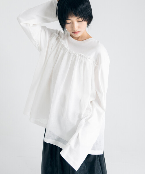 <デザイン>- 異素材が特徴のロングスリーブ- 切替部分にフリル- ゆったりとしたシルエット- クルーネック<素材>- 薄手で肌触りの良いコットン素材- 透け感のあるシャツ素材をドッキング※着用、お取り扱いの際は商品についておりますアテンションタグ、洗濯ネームを必ずご確認ください。※モデル撮影画像は、光の当たり具合やパソコンなどの閲覧環境によって、実際の色味と異なって見える場合がございます。商品の色味は商品単体で撮影した詳細画像をご参照ください。メーカー品番:org frl lyr t shirteunoia | ユノイア2014年に設立された韓国のブランド。‘’eunoia‘’はギリシャ語で「美しい考え」という意味。韓国の彫刻、建築、陶器、瓦などによく見られる、なだらかな曲線からインスピレーションを受け、黒と白を基調とした繊細なスタイルを表現。豊かなシルエットとクラシックかつユニークな、美しいスタイルを展開しています。