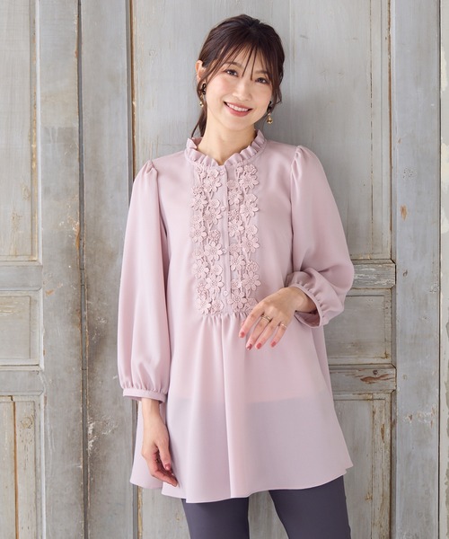 【Hand wash OK】フロントにケミカルレースをあしらったデザインブラウス。控えめなフリルのカラーが上品です。フレアに少し広がる長めのチュニック丈で、腰回りをふんわりカバー。フロントボタン開き。ベージュ、ワインレッド、ブラックの全3色。************************************生地感: 普通伸縮性: なし透け感: ベージュは若干あり裏 地: 裏なし洗 濯: 水洗い可************************************モデル身長: 166cm/ 38号着用詳細着用モデル身長 166cm / 着用サイズ 38号*取り扱いについては、商品についている品質表示でご確認ください。*撮影環境により、実際と色味が違って見える場合があります。また、PC・スマートフォンなどにより、製品と画像のカラーが異なる場合もございます。*商品画像はサンプルのため、色味やサイズ、プリント位置、仕様などに変更がある場合があります。*50号は一部の店舗・ONLINE SHOPのみの展開となります。取扱いしていないサイトもございますのでご了承ください。【Rose Tiara/ローズティアラ】フェミニンな愛らしさと、大人のエレガンスを一度にまとう服。「可愛い」をずっと手放さない、あなたのためのブランドです。素材選びからデザイン、パターンまでを一貫して行い、タックの向きやギャザー分量、フリル位置などを36・38・40号と42・46・50号では調整し、パターンを分けることで美しいシルエットと着心地の良い服を提案します。