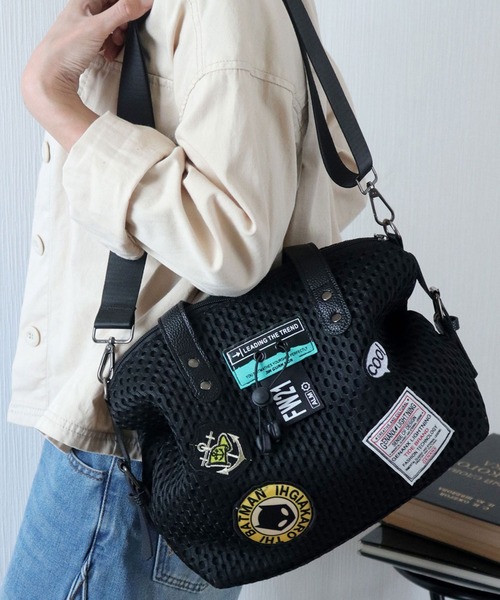 【選べる2サイズ♪】【大容量◎】【ワッペンカスタムがおしゃれなボストンバッグ】大人気、カスタムワッペンボストンバッグ/トラベルバッグ。デザイン性の高いワッペンを縫い付け、目に留まるストリート&ミリタリーデザイン。ダブルラッセルメッシュをバッグ本体に使用することで、クッション性のあるふっくらとした使い心地に♪○選べる2サイズ・大きすぎず小さすぎない、デイリー使いにちょうどいいMサイズ・A4資料はもちろん、1泊2日のプチ旅行に最適な大容量のLサイズ◯斜め掛けスタイル可!2WAY仕様1way-肩掛けハンドバッグ2way-斜めがけショルダーバッグ普段使いのほかにも、スポーツやアウトドア、レジャー、海、山、キャンプなどにもオススメ!キレイめにも、大人カジュアルにも合わせやすい大人かわいいボストンバッグです。韓国風Y2K、ストリート系、スポーツMIX、ダークコア、グランジ系などのトレンドスタイルとの相性も◎[仕様](L/M共通)・メイン口:ファスナー開閉・内側:小物ポケット×1、ファスナーポケット小×1・体側:独立式ファスナーポケット×1・肩紐:着脱式&長さ調節可能[サイズ/重さ]【M】高さ25cm/下横幅27cm/奥行(底マチ)12cm/持ち手高さ10cm/肩紐長さ最長118cm330g【L】高さ35cm/下横幅40cm/上横幅48cm奥行(底マチ)13cm/持ち手高さ25cm/肩紐長さ最長118cm460g[素材]ダブルラッセルメッシュ(ナイロン製)/PUレザーおすすめのシーン通勤 オフィス 通学 デート ディナー オケージョン フォーマル サブバッグ、旅行、レジャーなど幅広くお使いいただけます。クリスマスやお誕生日などのプレゼントやギフトなどにも最適な仕上がりです。▼ブランド 【florge】 -フロージュ-「着る人の心や体を癒し包む服、何気ない日常をちょっとだけ特別な日に変えられるアクセサリー」をテーマに、おしゃれでかわいい商品からおとなめオフィスに使える商品までトレンドの人気アイテムをご提案するレディースブランドです。プチプラ商品を多く取り扱っているのも嬉しいポイント♪画像付近のブランド名からぜひご覧ください。