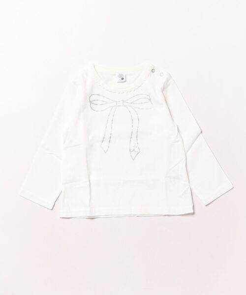 大胆なリボンのプリントと襟回りのレースが可愛いTシャツです。カーディガンやシャンパースカートのインナーにもおすすめです。【tickle museum】シックなカラーとさりげないデザインで、普段着使いはもちろんお出かけ着としても活躍できるベビーブランド。いつもかわいい赤ちゃんたちを笑顔にするアイテムがいっぱいです。