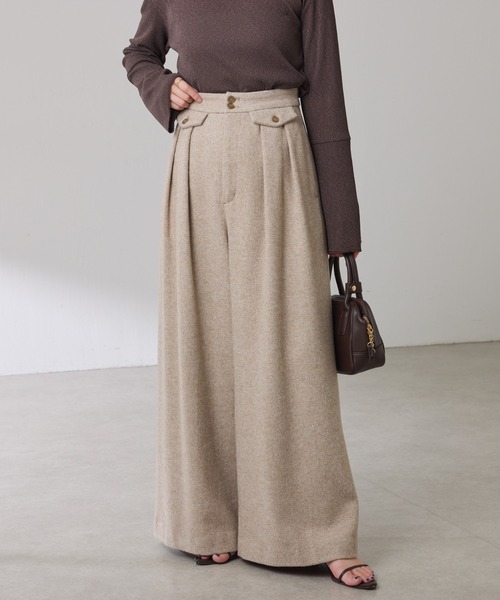 シンプルなトップスと合わせてもサマになるツイードライクワイドパンツ【POINT】・ネップ調のツイードライクな素材を使用したタックワイドパンツ。・ウール入りの厚手の生地なので真冬も暖かく過ごせて、裏地を付けることで肌が弱い方も安心して着用可能◎・ややハイウエストの仕様で脚長効果も抜群。・シンプルなデザインながらウエスト周りやポケットがワンポイントに◎※フロントのポケットはダミーです【おすすめコーディネート】秋口にはシアートップスと合わせて抜け感を出したり、冬にはショート丈のニットと合わせるとバランス良く決まります。【おすすめのスタイリングアイテム】・ラメリブスクエアカットソー CLZ1052406A0003・ウール混シアータートル CLZ1052406A0008・バルーンレイヤードスカート CLZ5052418A0001【素材】表地:ポリエステル70% 、毛30%裏地:ポリエステル100%透け感:なし裏地:あり伸縮性:なし光沢感:なし洗濯:ドライクリーニング【気になる商品は「お気に入り」登録を】 ハートマークをクリックし、お好きなカラーを選んでお気に入りに登録すると入荷情報や残り1点の通知、完売カラーの再入荷、セール情報などを受け取ることができます。※撮影場所やお使いのモニター環境により若干お色味が異なる場合がございます。特にロケの撮影では明るく見える傾向にございます。詳細撮影画像で色味をお確かめくださいます様お願いいたします。※サンプルで撮影をしております。若干の仕様が変更になる場合がございますので予めご了承の上ご注文くださいますようお願いいたします。※サンプルでの採寸のためあくまで目安となります。予めご了承ください。≪返品・交換について≫・着用後、洗濯後の返品・交換は致しかねます。・商品到着後、着用前に商品状態のご確認をお願い致します。