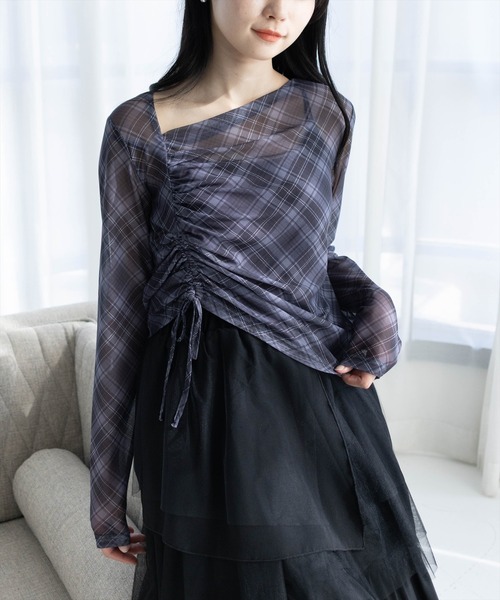 周りと差がつくアシメデザイン!チェック柄シアードロストトップス 【デザイン】 ドロストがかわいいレトロムード漂うチェック柄シアードロストトップス! アシンメトリーなデザインで周りと差がつく1枚◎ くしゅっと絞れるドロストと柔らかなシアー素材で 女の子らしさ満点です。 【素材感】 着心地の軽いポリエステル素材 伸縮性:あり/透け感:あり / 裏地:なし 手洗いによる洗濯可 / ドライ・ウェットクリーニング可 【コーディネート】 ミニスカートと合わせて甘めガーリーに! デニムでカジュアルダウンすれば、デートにもぴったりな抜け感コーデに◎ 中にキャミを仕込んで、透け感を楽しむレイヤードスタイルもおすすめ! 【※お取り扱い上のご注意】 1:モニター環境等により実際の商品と多少色味が異なって表示される場合がございます。予めご了承下さい。 2:屋外で撮影された商品は、天候により多少実際のカラーと異なる場合があります。商品のカラーはトルソー(マネキン)の商品画像をご参照ください。 3:濃い色の商品は、お洗濯や摩擦等による移染にご注意ください。 4:末永くご愛用頂く為に、アテンションタグ・洗濯ネームを必ずご確認の上、着用又はお取り扱い下さい。 5:生産時期により、色、サイズ、デザイン、素材の質感が多少が異なる場合がございます。あらかじめ御了承下さいませ。