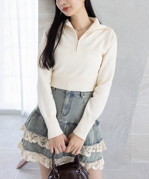どんなコーデにもすっとなじむ!オーバーカラーハーフジップショート丈ニットトップス 【デザイン】 ハーフジップデザインがアクセントになったショート丈ニット。 コンパクトな丈感で、ボトムとのバランスが取りやすいシルエット。 柔らかな風合いで、カジュアルにもきれいめにも着こなせます! 【素材感】 着心地の軽いポリエステル素材 伸縮性:あり/ 透け感:IVのみ若干あり/ 裏地:なし 手洗いによる洗濯可 / ドライ・ウェットクリーニング可 【コーディネート】 ハイウエストのワイドパンツやマーメイドスカートと合わせれば スタイルアップ効果抜群。 カーゴパンツやデニムと合わせればカジュアルコーデに◎ 【※お取り扱い上のご注意】 1:モニター環境等により実際の商品と多少色味が異なって表示される場合がございます。予めご了承下さい。 2:屋外で撮影された商品は、天候により多少実際のカラーと異なる場合があります。商品のカラーはトルソー(マネキン)の商品画像をご参照ください。 3:濃い色の商品は、お洗濯や摩擦等による移染にご注意ください。 4:末永くご愛用頂く為に、アテンションタグ・洗濯ネームを必ずご確認の上、着用又はお取り扱い下さい。 5:生産時期により、色、サイズ、デザイン、素材の質感が多少が異なる場合がございます。あらかじめ御了承下さいませ。