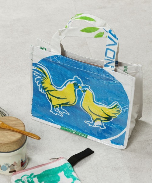 アジアン雑貨《ベトナム》ランチトートベトナムの飼料袋をリメイクしたポップなデザインが魅力的なランチバッグ。飼料袋は、エコでありながらしっかりとした素材を使用しているため、とっても丈夫。同じデザインの袋でもカットする部分によって異なったデザインになるのもハンドメイドならではのポイント。こちらのバッグはお弁当箱を入れたり、ランチに出るときに持つのにちょうど良いサイズ。汚れてもさっと拭けるので、レジャーに持って行っても◎マチがあるので、見た目以上にたっぷり収納できます。■原産国:ベトナム※製造上、PVC特有のにおいがつきます。また、素材のもつ特性として、特有の匂いがございます。開封後に強く感じられますが、時間が経つにつれて和らいでいきます。においが気になる場合は、風通しの良い場所に置いてください。ーーーアジアン雑貨 ランチバッグ トート エコ ハンドメイド ーーー