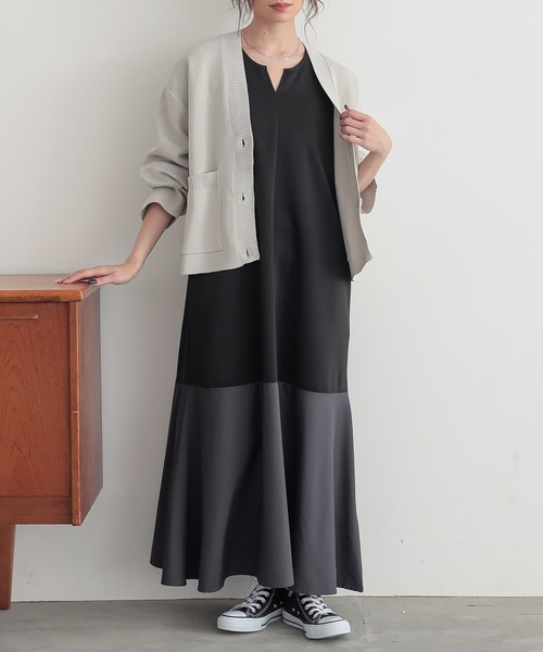 動くたびに揺れる裾の配色デザインが印象的な、配色Aラインワンピース。 一枚で着映えする、大人のためのデザインワンピースです。 すっきりとしたAラインシルエットが身体のラインを自然にカバーし、 キーネックデザインが首元に抜け感をプラス。 縦のラインを意識したシルエットで、上品かつ大人な印象に仕上げました。 身頃には程よく厚みのあるポンチ素材を使用。 きれいめな表面感でシルエットを美しく保ち、快適な着心地を実現します。 裾部分にはシャカシャカとしたナイロン素材をドッキングし、 ほんのり光沢感のある異素材ミックスデザインがさりげないアクセントに。 同系色でまとめた配色デザインなので派手になりすぎず、 シンプルながらも周りと差のつくスタイリングが完成します。 一枚でコーディネートが決まる、 デイリーからお出かけまで活躍する配色デザインワンピースです。 ♦SIZE 【1/2】 着丈:123cm/126cm 肩幅:39cm/45cm アームホール:36cm/40cm バスト:102cm/114cm ウエスト:114cm/124cm ヒップ:126cm/138cm 裾周り:200cm以上/200cm以上 ♦製品についての注意書き 染色の特質上、発汗や摩擦により色落ちすることがありますのでご注意ください。 また、着用中の摩擦により色移りしやすい特性がありますので、白や淡色との組合わせはご遠慮ください。 他の製品に色が移ることがありますので、一緒に洗わず単独で洗ってください。 ご了承の上、ご購入いただきますようお願いいたします。 ....................................................................................... n'OrLABEL ほかにない、私のデイリーウェア 毎日の生活を心地よく自分らしく過ごすための服。 遊び心を取り入れた、大人のカジュアルスタイル。 .......................................................................................