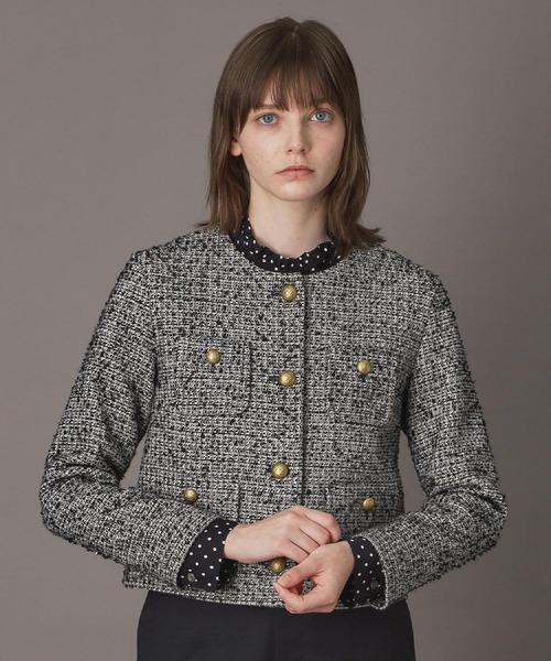 【良質なブッチャーツイードを使用し、4ポケットデザインで仕上げた、大人の品格ジャケット】 ●表情豊かで上品なブッチャーツイード素材 ●デザイン性のある4ポケット仕様 ●フロントとポケットのエンブレムボタンが華やかなアクセントに 【こだわり】 表情豊かなブッチャーツイード素材に、エンブレムボタンをあしらった4ポケットジャケット。 フロントとポケットに配されたボタンがクラシカルで上品なアクセントになり、羽織るだけで華やぎのあるスタイリングが完成します。 コンパクトなサイズで、釦をすべて留めてコーディネートすれば、主役級な活躍が期待できる一枚。 きちんと感とこなれ感を絶妙に兼ね備え、デニム合わせでカジュアルにも、ワンピースやスカートでキレイめにも着こなせる大人の着映えジャケットです。 【素材】 ざっくり感のあるブッチャーツイード素材を採用し、豊かな表情と程よい肉感が魅力。 再生ウールを使用したサステナブル素材で、環境にも配慮しながら上品な風合いを実現。 重い印象になりずらく、季節の変わり目にも活躍する1着です。 こちらの商品には、同素材のセットアップスカートもございます。 品番:085-74017 ※照明の関係により、実際よりも色味が違って見える場合があります。また、パソコン・スマートフォンなどの環境により、若干製品と画像のカラーが異なる場合もございます。 店舗へのお問い合わせ商品番号:085-44004 ●製品寸法: 34(SS):着丈44cm B87cm 袖丈52cm 肩幅41cm 36(S):着丈46cm B90cm 袖丈53cm 肩幅42cm 38(M):着丈47cm B93cm 袖丈54cm 肩幅43cm 備考: