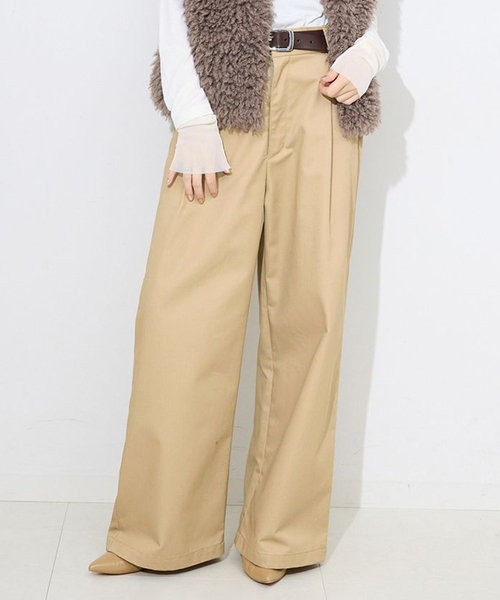 洗濯機使用可能/36.38.40サイズ展開/ポケット付き/リピートアイテム【2025AW】SLOBE IENA大好評につき《ベージュ》の追加生産が決定しました!※旧品番25030912003010の追加商品です。POINT・一つ持っていると万能なチノパンツが登場!・ワイドシルエットで気負わないデイリースタイルにもおすすめです。【素材の特徴】程良く光沢感のあるゴワつきのない上品な厚手チノ素材を使用しました。ポリエステル混素材で耐久性が高く、シワになりにくい効果も期待できます。また、綿混で通気性があり快適な着心地も期待できます。【デザイン】フロントにタックが入ったワイドシルエットのチノパンツ。ウエストに少しカーブを付ける事で、ワイドなシルエットでありながらもスッキリとしたウエスト周りを実現。【コーディネート】トップスを選ばず着用いただけます。今期トレンドのショート丈のトップスにも相性の良いワイドシルエットのパンツです。**********************透け感:なし裏地:なし伸縮性:なし光沢感:なし生地の厚さ:普通**********************【スタッフ着用コメント】《スタッフ名:Yuka》年齢:20代後半/身長:172cm/体型:細身/普段サイズ:M~L/着用サイズ:38サイズ感:ワイドシルエットで足の形を拾わず着られます。足の甲につくくらいの長さ。太ももまわりにタックが入っているので、ぴたっとせず着やすいです。素材感:オールシーズン着れそうなチノ素材です。着心地:股上が深く、ゆるっとしていて足回りにゆとりがあるので歩きやすいです。**********************※取り扱いについては、商品についている品質表示でご確認ください。こちらの商品は、SLOBE IENAでの取り扱いになります。直接店舗へお問い合わせの際はSLOBE IENA店舗へお願い致します。※照明の関係により、実際よりも色味が違って見える場合があります。またパソコン・スマートフォンなどの環境により、若干製品と画像のカラーが異なる場合もございます。予めご了承ください。※商品の色味は、商品アップ画像をご参照ください。モデルサイズ:身長:163cm 着用サイズ:36本体:洗濯機洗い(弱)