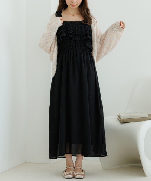 ■デザインボリューミーなフリルがポイントのキャミワンピース♡フリルに施されたスパンコールとチュールのレースが華やかでゴージャスな雰囲気に♪ウエスト位置を高めに設定しているのでスタイルアップ効果も抜群です!スカートはシフォン素材で軽やかな印象に仕上げました。厚手の裏地を使用している為、透けにくいのが嬉しい♡バックスタイルにはリボンをつけてポイントに♪デートやお食事会など特別なイベントにぴったりです。■おすすめコーディネートgorgeous lace cami2をインナーにfoggy knit cardiganを羽織った、ラメたっぷりのフェミニンコーデがおすすめ◎■flower/フラワー「love&joy」をコンセプトに、商品に愛を込め、お客様に楽しんでいただけるような、ナチュラルでガーリーなアイテムを提案していきます。【お買い物を上手にお楽しみいただくためのPOINT2つ】◎ 購入ボタン横の ♡ (ハートマーク)をクリック! 完売カラーの再入荷通知、残り1点の通知、セールの通知を受け取れます。 (クリックまたはタップで商品のお気に入り登録♪)◎ ショップのトップページにある ♡ (ハートマーク)「お気に入りショップに追加」をクリック! 新商品や再入荷等、いち早くブランドのお得な情報を受け取れます。 (ブランドのお気に入り登録♪)