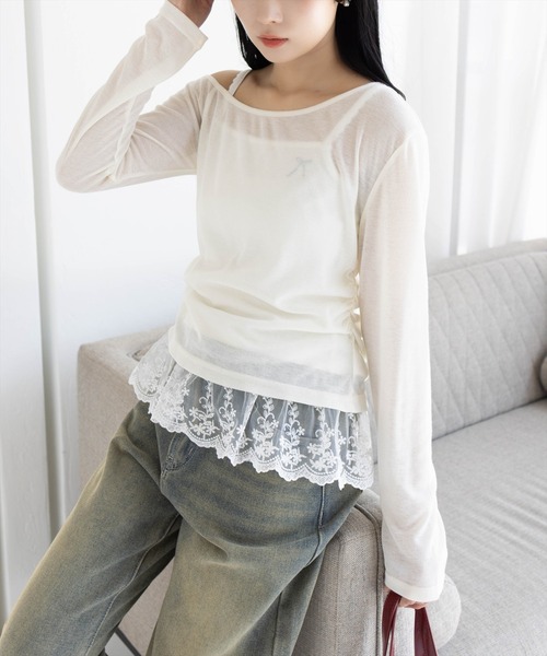 ゆるっと感にレースが映える!サイドシャーリングワンショルカットソー&レースキャミセット【デザイン】キラッと輝くラインストーンのリボンロゴがワンポイントに♪ワンショルのカットソーとレースキャミの重ね着デザインで甘さと抜け感をミックス。セットでも単品でも使える、着回し力バツグンのアイテムです!【素材感】着心地の軽いポリエステル素材伸縮性:あり/透け感:あり/裏地:なし 手洗いによる洗濯可 / ドライ・ウェットクリーニング可【コーディネート】甘めのディテールには、ダメージデニムやカーゴパンツを合わせてカジュアルダウンさせるとストリートミックスな着こなしが完成します!ティアードスカートやレース素材のボトムスと合わせれば、フェミニン系にもぴったり♪ガーリー派さんにもおすすめの着回し力です。スラックスとヒールを合わせれば、程よく大人っぽいカジュアルスタイルにも応用できる万能アイテムです◎【※お取り扱い上のご注意】1:モニター環境等により実際の商品と多少色味が異なって表示される場合がございます。予めご了承下さい。2:屋外で撮影された商品は、天候により多少実際のカラーと異なる場合があります。商品のカラーはトルソー(マネキン)の商品画像をご参照ください。3:濃い色の商品は、お洗濯や摩擦等による移染にご注意ください。4:末永くご愛用頂く為に、アテンションタグ・洗濯ネームを必ずご確認の上、着用又はお取り扱い下さい。5:生産時期により、色、サイズ、デザイン、素材の質感が多少が異なる場合がございます。あらかじめ御了承下さいませ。