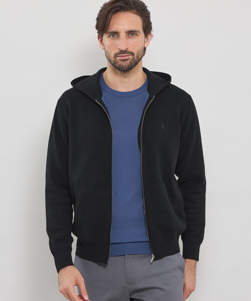 【ウォッシャブル】【着用推奨シーズン:春・秋・冬】<素材>表面に綿とウールの混紡糸を、裏面にTEXBRID(テックスブリッド)という高伸縮機能糸をつなぎ合わせた接結編みをしています。TEXBRIDはバネ状の分子構造でストレッチ性・形態安定性を持つ為、伸縮性に富み、軽く、型崩れしにくい素材です。<デザイン>カンガルーポケット付きのフルジップパーカーです。ニットならではの上品な見た目と構築的なフォルムが他にはない、軽さと着心地が抜群の新感覚のパーカーです。左胸にダンディマン刺繍が入ります。