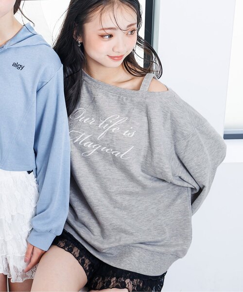 algy(アルジー)のトレーナー「エンジェルワンショルトレーナー」。コーデが決まる!これを持っておけば間違いなしのトップスです◎XXS・・・125~135cmXS・・・135~145cmS・・・145~155cmM・・・155~165cm【 algy ーアルジー ー 】『おしゃれを楽しみたいティーンズのリアルクローズ』着たい 欲しい トレンド・・・全部そろう小中学生向けブランドです。【取り扱い表示】40℃を上限に洗濯機で洗濯、デリケートアイテムモード、ネット使用、漂白剤を使用禁止、色物は同系の色と一緒に、洗濯後直ちに取出し、タンブル乾燥不可、日陰で吊り干し、低温でアイロン、商業ドライクリーニング不可【ご注意事項】この商品は着用中の摩擦や洗濯により毛羽の乱れ、毛羽脱落、毛玉が生じることが有ります。できるだけ美しくご利用頂く為に次のことにご留意下さい。○毛玉は毛玉取り器またはハサミで丁寧にカットして下さい。○毛羽が他に付着した際はテープやブラシで除去して下さい。○他の製品とは洗わず、単独でお洗濯して下さい。○タンブル乾燥はお避け下さい。この製品は特殊加工(スパンコール・ラインストーン・スタッド等)を使用しております。永久的なものではなく、着用中の強い摩擦や洗濯を繰り返すことにより、破損したり、光沢が消失していく可能性があります。できるだけ美しくご利用頂く為に次の事にご留意下さい。○ もみ洗い、タンブラー乾燥は避けて下さい。○ 脱水はネットに入れ、弱くかけて下さい。○ 装飾品にはアイロンを当てないで下さい。※商品により多少の誤差が生じる事がございます。あらかじめご了承下さい。※ご使用のパソコンやブラウザの環境により、実際の色とは多少異なる場合がございます。※モデル着用写真についてはイメージの為、実際の商品とカラーや仕様が異なる場合がございますので、商品画像をご覧ください。