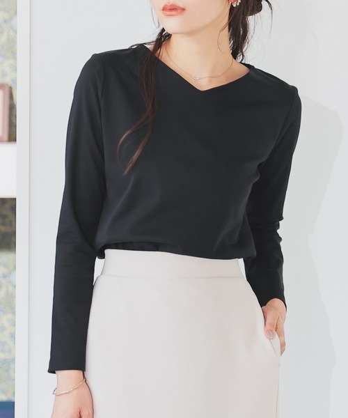 こだわりの上質素材 【デザイン】 ステッチをなくした、首もとすっきりの広すぎないVネックで、高見えが叶う上品デザイン。 ボディラインやインナーの透け感が抑えられるフロント二枚仕立て。 すっきりめの幅と腰にかかる丈感。 【素材・機能】 きめ細かく滑らかな、綿100%素材。 伸縮性もあり着心地抜群。 【スタイル】 1枚でも、ジャケットやカーディガンのインにも使え、テーパードパンツやフレアスカートなどと合わせた、お仕事やお出かけのきれいめスタイルに、ロングシーズン活躍。 ※前身頃のみ二枚仕立て 品番:578-11-9736
