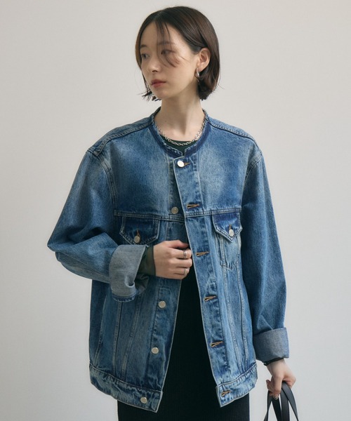 羽織るだけで"こなれ感"、計算ずくの美人シルエットデニムジャケット <POINT> カジュアルを格上げする、ノーカラーデザイン。 計算され尽くした絶妙シルエット。 本格的なヴィンテージライク加工。 ご自宅で手洗い可能なイージーケア仕様。 【デザイン・シルエット】 襟元を大胆に切りっぱなしにすることで、きれいめな中にラフな抜け感をプラス。 全体的にはオーバーサイズでありながら、肩のラインは広すぎず、すっきりと見せることにこだわった絶妙なシルエット。 気になるボディラインを優雅にカバーしつつ、トレンド感のある着こなしを叶えます。 【素材感】 長年愛用してきたかのような、深みのある色落ち感が魅力のヴィンテージライクなデニム生地。 しっかりとした厚みの綿100%素材は、着込むほどに柔らかく身体に馴染み、自分だけの一着へと育っていきます。 【カラー】 ブルー 1色展開 【スタイリング】 フェミニンなワンピースやプリーツスカートに合わせた甘辛ミックスタイルから、スラックスと合わせたきれいめオフィスカジュアルまで変幻自在。 Tシャツとデニムに羽織る王道スタイルも、このジャケットなら一気に垢抜けた印象に。 裏地:なし 光沢:なし 伸縮性:なし 透け感:なし 生地の厚さ:普通 ポケット:あり ※照明の都合上、多少の色ブレが生じてしまう可能性がございますので、予めご了承くださいますようお願い致します。 --------------------------------------------------- ●お気に入り登録でお得情報を手に入れよう! 「商品のお気に入り登録」をすると、再入荷通知や、ラスト1点の通知、セールの通知など、お得情報が届きます。 また、マイページでいつでも確認が可能になります。 「ブランドのお気に入り登録」をすると、新商品や再入荷、などいち早くブランドの最新情報をお届けします。 ぜひ、ご利用ください。 ----------------------------------------------------