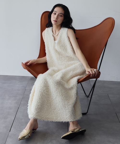 シープ調のボア素材を使用した目を惹くノースリーブワンピース。 深いVネックで様々なレイヤードスタイルを楽しめるデザインです。 Aラインシルエットで足元までしっかりカバー。 1枚でシンプルにお召しいただいても、インナーに薄手のニットやブラウスを重ねていただいても◎。 お好みの着こなしでロングシーズン楽しめるアイテムです。 素材 くるくるとした巻きが特徴の薄手のシープ調のボア生地を使用しています。 総裏仕様で肌触りもよく、目を惹くトレンド素材になります。 詳細情報 厚み:□薄手 □普通 ■厚手 透け感:■なし □あり 光沢感:■なし □あり 伸縮性:■なし □あり 裏地:□なし ■あり カラー展開 ブラック(黒)、アイボリー インフォメーション 【商品のお気に入り登録】 再入荷通知やラスト1点の通知、セール情報を受け取ることができます。 【ショップのお気に入り登録】 新商品や再入荷、お得な情報などを受け取ることができます。 ELFRANK ELFRANK(エルフランク)は、「Elegant(上品・優雅)」×「Frank(気さくな・身近な)」をキーワードに、 ライフスタイルに寄り添った新しいカジュアルスタイルを発信するブランドです。 日常のディテールにこだわり、自分らしさを楽しみ磨き上げていく... そんな女性に向けて、等身大の美しさと憧れを表現したファッションアイテムを提案します。 ※商品画像は撮影時の光や角度、お使いのモニター環境により実物の色味と異なって見える場合がございます。 ※記載のサイズは実寸サイズとなります。採寸箇所により、差が生じる場合がございます。 ※通販の特性上、発送上の状態によって商品にシワがついている場合がございます。 ※着用、お取り扱いの際は、商品に付いている品質表示とアテンションタグを必ずご確認ください。