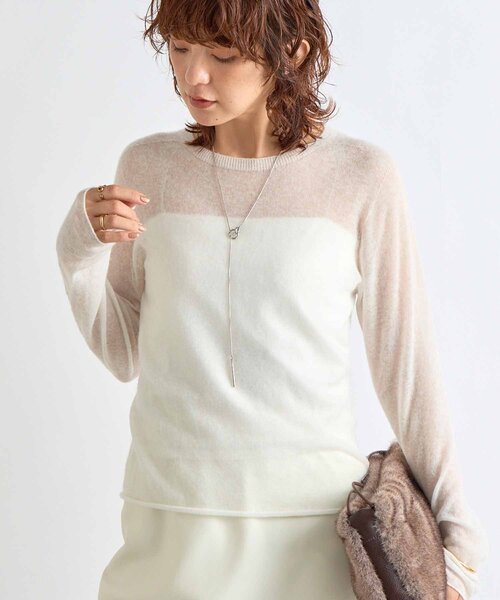 繊細な透け感と柔らかく滑らかな肌触りが魅力 ●デザイン ・糸の風合いの良さを生かしたミニマルなクルーニット ・ホールガーメントならではのすっきりとした仕立てと着心地の良さもポイント ・ボトムを選ばず合わせやすい1枚 ・繊細な透け感が着こなしにニュアンスを出してくれます ・クリーミーなオフホワイトに、トレンドのピンク、シーズンムード高まるグレーの3色展開 ●素材 羊毛 60% ナイロン 35% カシミヤ 5% ・高品質のウールを使用したカシミヤ混の柔らかく滑らかで繊細なタッチが特徴の糸を使用 洗濯方法:手洗い可 透け感:あり 裏地:なし 伸縮性:あり 生地の厚さ:薄手 光沢:なし -------------------------------------------------------------------------------- 【お買い物をもっと便利に楽しく♪】 『♡』をクリックでお気に入り登録 ✓「商品のお気に入り登録」で・・・ ラスト1点や再入荷の通知が届きます。登録して頂いた商品だけが対象となる、あなただけのタイムセールが開催されることも! ✓「ブランドのお気に入り登録」で・・・ 新商品や再入荷など、いち早くブランドのお得な情報を 受け取ることができますので、ご登録をおすすめします! -------------------------------------------------------------------------------- 【注意点】 ※画像の商品は光の照射や角度、お使いのモニター環境により、 実物と色味が異なる場合がございます。 ※入荷状況により、お届け予定が前後する場合があります。 ※お客様への発送が店頭販売より遅れる場合もあります。 ※追加生産商品は、一部の店舗、通販で販売中の場合がございます。 予めご了承下さい。 ----------------------------------------------------------------------