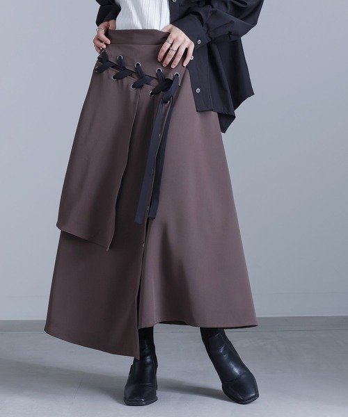 ■デザイン前見頃にあしらわれたハトメ×配色紐のレースアップが目を惹く、ラップ風デザインのフレアスカート。立体感のあるディテールがアクセントになり、コーディネートにこなれた印象をプラスします。ウエストは後ろゴム仕様で、着脱がラクながらも前から見るとすっきりとしたシルエットをキープ。女性らしいフレアラインと計算されたデザインで、きれいめにもカジュアルにも活躍する一枚です。■ディテール・ウエストは後ろゴム仕様■コーディネートレースアップがポイントのフレアスカートには、シンプルな白シャツを合わせてクリーンかつ程よく甘さを抑えたバランスの良いスタイリングに。Tシャツと合わせてカジュアルダウンするのもおすすめです。足元はローファーやレザーサンダルで引き締めれば、オフィスからお出かけまで幅広く活躍。きちんと感の中にトレンド感を添える、大人の洗練コーデが完成します。■素材落ち感のある布帛素材を使用し、身体のラインに自然に沿う上品なシルエットを実現。軽やかでなめらかな肌触りは、着心地の良さも抜群です。