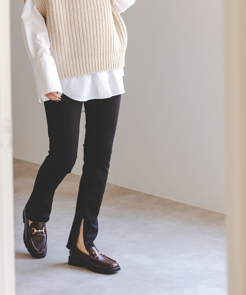 肉感が特徴のハイストレッチのポンチ素材を使用したレギンスが登場。フィットしながらも体の凹凸をカバーしてくれる素材なのが嬉しい。手洗い可能なのでデイリーに活用でき、寒さを感じにくいあたたかな1本です。デザインはシンプルながらもパンツ風のフロントデザインが特徴的。左サイドファスナー開きでストレッチ素材の着脱のしやすさにも考慮。裾にコンシールファスナーを合わせており、シューズやスタイリング合わせて開け閉めアレンジが可能です。オーバーサイズのジャケットやニットに合わせる着こなしが今年らしく、またロングブーツと合わせるのも◎。**********************透け感:あり(ナチュラル)・なし(ブラック)裏地:なし(起毛素材)伸縮性:あり光沢感:なし生地の厚さ:普通**********************【スタッフ着用コメント】年齢20代前半/身長:155cm/体型:やや細身/普段サイズ: 34 /着用サイズ:36サイズ感: 脚のラインにフィットするコンパクトなサイジング。ウエストゴムなので伸縮性があり、リラックスして穿くことができました。素材感:裏が微起毛になっているので、冬も暖かく穿けそうです。着心地:ボトムスとして1枚で穿くというよりは、ロング丈のワンピースやタイツとして穿くのがおすすめです。**********************※ナチュラル(016)のみ色あせ:日光や蛍光灯の光に弱く、色あせ(変色)しやすい性質があるので、長時間の直射日光は避けてください。※取り扱いについては、商品についている品質表示でご確認ください。※こちらの商品は、NOBLEでの取り扱いになります。直接店舗へお問い合わせの際はNOBLE店舗へお願い致します。※照明の関係により、実際よりも色味が違って見える場合があります。またパソコン・スマートフォンなどの環境により、若干製品と画像のカラーが異なる場合もございます。※商品の色味は、商品アップ画像をご参照ください。ブラック着用スタッフ身長:160cm 着用サイズ:38ナチュラル着用スタッフ身長:160cm 着用サイズ:36モデルサイズ:身長:163cm 着用サイズ:38本体:手洗い可能
