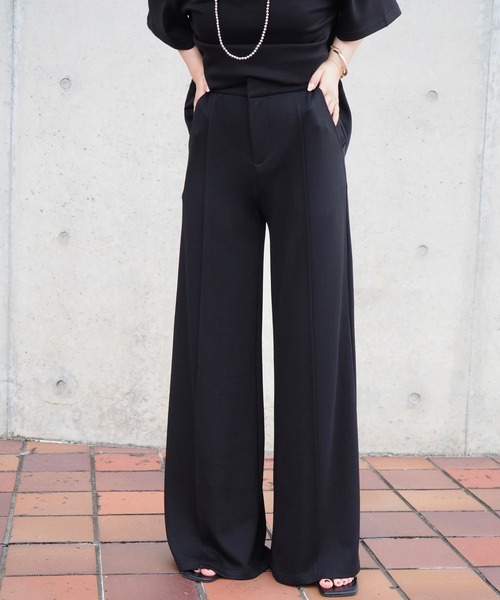しなやかでストレッチ性のある生地を使用したワイドパンツ。ウエスト下から施されたセンターシームが、脚線を引き締めつつ、足をすっきり長く見せてくれます。バックスタイルはダーツを施した、腰やヒップまわりがきれいに見える設計。フィット感がありながらも伸縮性があるので快適な穿き心地です。ベーシック且つきれいめのデザインは、オンオフ問わず幅広いスタイリングにマッチする優れもの。こちらは同素材のトップスとセットアップでの着用が可能です。■DETAIL・透け感:ややあり・生地の厚さ:普通・裏地:なし・伸縮性:ややあり<注意点>・色合いはモニター環境により若干の誤差が出ます。・サイズは平置きにして測定していますが、測り方によって誤差が出る場合がございます。・入荷・生産時期により、色、サイズ、素材など多少異なる場合がございます。・本製品は生産過程におきまして、生地を織る際の糸の継ぎ目や多少のほつれが生じることがあります。・簡易包装となっており、保管・梱包時にシワが伴う場合がございます。
