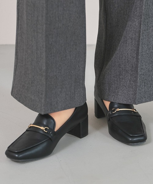 ゴールドビットがアクセント 【デザイン】 ひねりを加えた華奢なチェーンビットが上品なデザイン。 スクエアトゥの美しいフォルムながら、安定感のあるヒールで歩きやすさも抜群。 【素材・機能】 高級感のあるフェイクレザー・スエード調素材。 かかとは脱げにくく、靴底には安心の滑り止め付き。 【スタイル】 きれいめコーデやオフィスコーデにはもちろん、マニッシュルックなソックス合わせも楽しめる一足。 ※湿度・摩擦により多少色落ちする可能性があります。 品番:235-134-9307