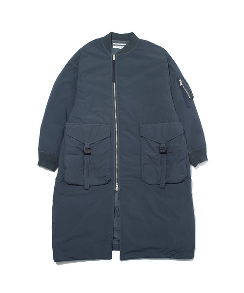 新しく提案するガーメントダイダウンコレクション。 縦横の番手差を生かした、程よい表情感のあるナイロン生地を使用した製品染ダウン。 ナイロンの機能性を持ちつつ、製品染を施すことで深みのある独特な色合いの表現が特徴のMA-1タイプのロングコート。 -裏キルトでフロントのメタルファスナーが右寄りについた、アシンメトリーデザインが特徴。 -フロントに2つのフラップ付き立体ポケット、袖にはユーティリティポケットを装備。 -ドロップショルダー、アームホールは広めに設計しユニセックスで切れるオーバーサイズの提案。 -軽量でボリューム感ある仕上がり。 -ダウン -軽量 -製品染の特性上、着用によるアタリが出てくる事で経年変化を楽しめます。 -製品染 アイテムが完成した後に染色を行う方法で、色ムラや微妙な色の変化を加えることで、着古したようなヴィンテージ感や自然な風合いが生まれます。この技法を使うと、デニムやTシャツなどのカジュアルアイテムに、柔らかさや深みが出て、独特の色落ち感や立体感が楽しめます。また、染色後に洗い加工を加えることで、さらに風合いを調整し、使い込んだような自然な仕上がりになります。