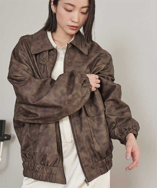 ビンテージライクなムラ染めが個性的で、羽織るだけで周囲の視線を集めるフェイクレザーブルゾン。■Point・ムラ染めデザイン:味わい深くおしゃれなヴィンテージ感を演出。・高見えフェイクレザー素材:本革のような質感ながら軽くて動きやすく、デイリーにぴったり。・女性らしいボリューム感:裾や袖のたぽっとしたシルエットが可愛らしさをプラス。・程よいオーバーサイズ:リラックス感のある着心地で着やすさ抜群。■Coordination・カジュアルスタイルに最適:デニムやスニーカーと合わせて、ラフでこなれた印象に。・フェミニンなアイテムと合わせても◎:ワンピースやスカートと合わせて甘辛ミックススタイルも楽しめます。・レイヤードにも便利:ニットやパーカーの上から羽織って季節感をプラス。一着でぐっとこなれ感が出る、大人カジュアルのマストアイテムです。※当商品は機械による生産の過程上、どうしても"生地を織る際の糸の継ぎ目"や多少の"ほつれ"、他繊維の"混紡"、また、形やサイズや柄に多少の"誤差"が生じる場合がございます。※サイズは、実寸サイズを測っているため多少誤差がでる場合があります。製造工程の関係上、各採寸箇所実寸(平置き)より【約-3cm~+3cm】程度は誤差の許容範囲とさせて頂いておりますので、予めご了承くださいませ。※メーカーより密封状態で入庫し、検品時に再度袋詰めを行っておりますが、素材により染料等の臭いが強い場合がございます。※発送上の状態によって商品がシワになる場合がございます。※商品により色落ち・色移りがある場合がございますので、品質表示をご確認の上、お取り扱いにご注意くださいませ。【伸縮性】裾と袖口にあり【透け感】なし