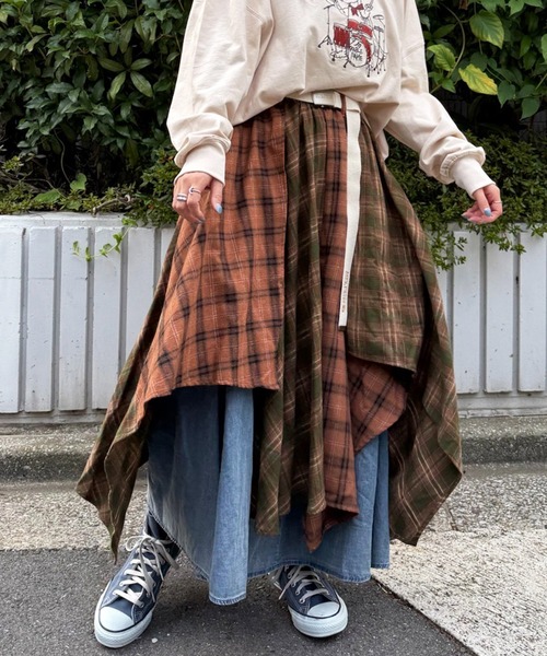 ■デザイン🌟大人気シリーズが待望の新作で登場🌟昨年も話題を集めた「ランダムチェックイレヘムスカート」が、今年はさらに進化して帰ってきました!季節を問わず活躍する万能スカートなので、春夏は軽やかに、秋冬はタイツやブーツと合わせてオールシーズン着回し可能!ランダムに配置されたチェック柄が、歩くたびに揺れて表情豊かに見せてくれる特別なデザイン。同じチェックでも異なる柄を組み合わせることで、奥行きと立体感のあるスタイリングが叶います。ベース生地にはデニムを使用しているので、甘くなりすぎず、Tシャツやスウェットなどカジュアルなアイテムとも相性抜群◎ライダースやブーツと合わせてロックに、シャツやカーディガンでレトロに、気分やシーンに合わせて幅広く楽しめます🎀カラーは個性の異なる2色展開✨・RED×BLACK → edgyでロックな雰囲気を楽しみたい方に。・GREEN×ORANGE → ナチュラルでカントリームードを取り入れたい方に。他には無いデザインで、周りと差をつけたいときにおすすめの一枚です💫■素材・ウエストゴム:あり(ウエスト一周ゴム)・光沢感:なし・生地の厚み:薄い※生地寄りの画像が実際の色味と近いものとなります。※ご覧のモニター環境や撮影環境により実際のカラーと異なる場合がございますので画像をご参照の上、ご了承頂けますようお願い致します。