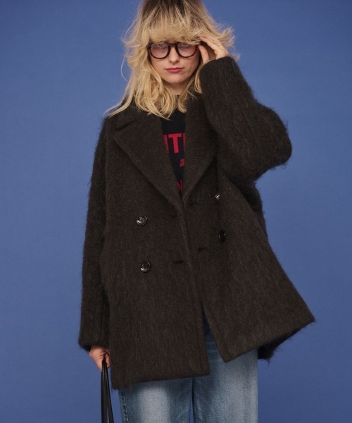 しっとりとした光沢感と繊細な毛足が美しい、モヘア混の上質シャギー素材を贅沢に使用したPコート。 クラシックなダブルブレストのPコートデザインに、 柔らかな素材感を掛け合わせることで、かっちりしすぎず、 やわらかな雰囲気をまとう新しい一枚に仕上がりました。 毛足の長いシャギー仕上げにより、 ふんわりとした軽さと奥行きのある表情が魅力。 モヘア特有の透明感と柔らかさが肌に優しく、 秋冬の着こなしをエレガントに引き立てます。 肩まわりにゆとりを持たせたオーバーサイズシルエットは、 厚手のニットの上からも羽織りやすく、 抜け感のあるバランスで今年らしい印象に。 ヒップを覆うやや長めの丈感も安心感があり、デイリーにもぴったりです。 【注意事項】 ※商品画像は、光の当たり具合やパソコンなどの閲覧環境により、実際の色味と異なって見える場合がございます。あらかじめご了承ください。 ※画像の商品はサンプルです。実際の商品と仕様、加工が若干異なる場合があります。 ※サイズ表記はあくまで目安となります。 ※その他の予約商品、通常商品との同時決済はできません。 ※入荷状況により、お届け予定が前後する場合があります。 ※お客様への発送が店頭販売より遅れる場合もあります。 ※追加生産商品は、一部の店舗、通販で販売中の場合がございます。予めご了承下さい。 ※商品を使用前に、タグ等に記載されている「取り扱い上の注意書き」「洗濯表示」を必ずご確認ください。 ※商品に不良が無い場合、包装紙および箱の彼損がございましても発送いたします。あらかじめご了承ください。 アイボリー モデル:H166 B72 W59 H82 着用サイズ:38 チャコールグレー モデル:H166 B72 W59 H82 着用サイズ:38
