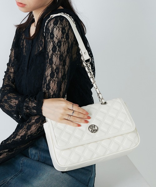 GYDA NEW COLLECTION " DOUBLE QUILTING "----------------------------------------------------------------------クロス上にダブルラインでキルティングを施した新シリーズもちもち感が手触りの良さを高めるとともにデザイン性も高めています本体には"gyda"のサークルメタルが付き、シンプルながらもエッジの効いたデザインにベーシックにお持ちいただけるブラック・アイボリーに今季注目カラーのレッドを加えた全3色展開----------------------------------------------------------------------p o i n t .しっかりとしたサイズ感のショルダーバッグ。小さ過ぎず、大き過ぎないサイズ感でデイリーで使いたくなるアイテムです。かぶせタイプのショルダーバッグは斜め掛けにする事でカジュアルに、肩掛けする事で大人可愛くお持ちいただく事が可能。しっかりとしたマチを持たせる事で見た目以上に荷物を収納する事が出来、普段お出かけに必要な荷物は全て収納出来るほど。内側にはファスナーポケットを備え、貴重品など他の荷物と分けておきたい物を収納しておくのに便利です。#キルティング#チェーンショルダー#サークルメタル----------------------------------------------------------------------b r a n d : GYDA / ジェイダ- L.A CASUAL -西海岸LAの空気感をイメージ。オンナらしい体のラインを露出し、シンプルなアイテムをシルエットや色や小物でエッジィにスタイリング。カジュアルで色気のあるオンナの子のスタイルを提案します。d e t a i l .サイズ :・約W26.5×H15.5×D7 cm ショルダー長さ:約65~120 cm※取り外し不可・重量:約460g・素材:本体 / 合成皮革 裏地 / ポリエステル<仕様>・マグネットホック式開閉・内側:ファスナーポケット×1・付属:保存袋・原産国:中国
