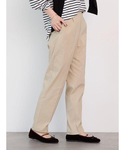 なだらかに細くなるテーパードシルエットがすっきりとした足元を演出するパンツ。生地には伸縮性があり、動きやすく快適な穿き心地を実現します。縦のラインを強調するセンタープレス入りが魅力。デイリーユースはもちろん、オフィスカジュアルにも大活躍するアイテムです。※商品画像は、撮影環境やお客様のご利用のPC・スマートフォンのモニター環境などにより実物と色味に差異がある場合がございます。【その他採寸】M ウエスト:[後ゴム仕様]64cm L ウエスト:[後ゴム仕様]66cm