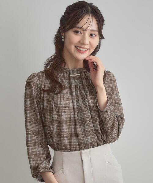 フロントにタックでタイ風のデザインをあしらったブラウス~POINT~襟元のタックの奥にループがついており、パール調は取り外し可能ですその日の気分でパール調なしで着ていただくことも可能ですご自宅でお洗濯される際は取り外していただくのがオススメです通勤はもちろんおでかけにもおすすめのきれいめアイテムです【素材・機能】薄手のジョーゼットにオリジナルのチェックプリントを施しております。マドラスチェックと小付きの千鳥柄の2柄での展開です※照明の関係により、実際よりも色味が違って見える場合があります。また、パソコン・スマートフォンなどの環境により、若干製品と画像のカラーが異なる場合もございます。【スタッフコメント】・saori(153 )今から秋まで長く楽しめるチェック柄が大人可愛いブラウスです◎アクセサリーなしでもオシャレにキマります!スカートはもちろんパンツとの相性もよく、ジャケットのインナーとしてもおすすめです◎【25AW NEW ARRIVAL】【25AW NEW COLLECTION】モデル情報:身長163cm B81 W56 H82 着用サイズ:38(M)店舗へのお問い合わせ商品番号:508-84008●製品寸法:36(S):着丈57cm B121cm 袖丈48cm 肩幅35cm38(M):着丈59cm B124cm 袖丈49cm 肩幅36cm40(L):着丈61cm B127cm 袖丈50cm 肩幅37cm42(LL):着丈62cm B130cm 袖丈51cm 肩幅38cm備考: