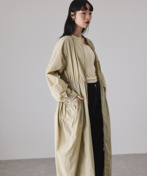 女性らしさを引き立てるコクーンシルエットが魅力。簡単に大人のスポーティスタイルが叶う、コートとしてもワンピースとしても重宝する2WAYワンピースコート◆2025-26秋冬◆ ADAM ET ROPE' FEMME 【Material】 自然なシボ感が特徴のナイロン100%の生地を使用。 軽量感が特徴で着心地が良い素材。 また形状回復性にも優れており、シワになりづらくケアしやすいアイテム。 【Design】 ワンピースとしてもコートとしても1着で2WAY楽しめるワンピースコート。 ナイロン100%の生地を使用し、少しスポーティーな印象に。 浮かせるようにつけたポケットから大胆にいれたギャザーでコクーンシルエットを表現。 ウエストにはドローコード付きでシルエットを自由に変えられる仕様。 【Color】 ニュアンスがありレディーな印象のベージュ、少し浅めのチャコールのようなブラックの2色展開。 【Styling Point】 ファスナーを閉じ、コクーンワンピースとして着用したり、薄手のナイロンコートとしても。 カジュアルな印象なので華奢なヒールシューズを合わせて女性らしく着こなしていただくのがオススメ。 --------------- 透け感:なし 裏地:なし 伸縮性:なし 光沢感:なし 生地の厚さ:薄手 開き方:フロントファスナー開き ポケット:両脇あり --------------- ◇モデル情報 身長:169cm size:F