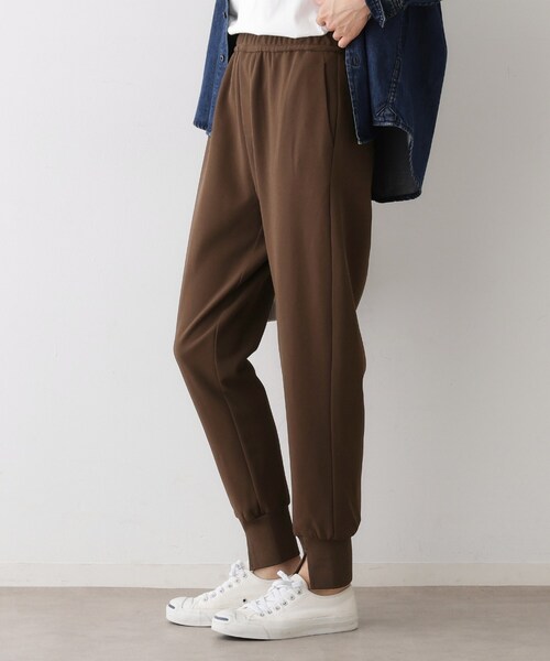 【デザインポイント】体のラインを拾いにくく、程よい肉感のあるカットジョーゼット素材を、ジョガーパンツデザインに落とし込みました。ストレッチが効いているので、快適な穿き心地。裾には編立のリブをつけています。【スタイリングポイント】Tシャツ、スニーカーあわせのカジュアルスタイルはもちろん、ジャケットとヒールにあわせたきれいめなスタイリングにもはまります。シャツ羽織りとタンクにあわせたヘルシーな着こなしもおすすめです。【素材ポイント】ストレッチ性のきいたカットジョーゼットを使用。表面はマットでキレイみえの素材感です。【仕様】・ポケット数:横×2 後ろ飾りポケット×2・ウエスト総ゴム・裏地なし※照明の関係により、実際よりも色味が違って見える場合があります。また、パソコン・スマートフォンなどの環境により、若干製品と画像のカラーが異なる場合もございます。モデル情報:身長168cm B76 W58 H86 着用サイズ:02(M)店舗へのお問い合わせ商品番号:F58-64031●製品寸法:00(XS):W~60cm H84cm 股下63cm 前股上29cm 渡り幅27cm 裾幅9cm01(S):W~62cm H86cm 股下64cm 前股上29cm 渡り幅28cm 裾幅9cm02(M):W~66cm H89cm 股下66cm 前股上30cm 渡り幅28cm 裾幅10cm03(L):W~68cm H92cm 股下68cm 前股上31cm 渡り幅30cm 裾幅11cm備考: