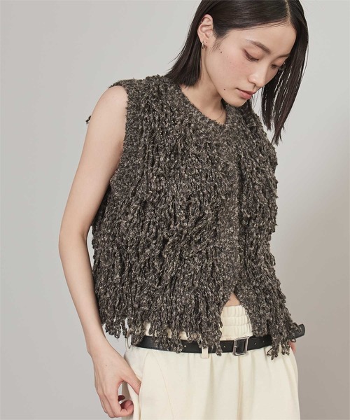 立体感と華やかなボリュームが魅力のフリンジニットベスト。■Point・毛足の長い糸を贅沢に使用:ふんわりとした質感が上品なフリンジデザインを実現。・動きのあるフリンジがアクセント:着るだけで旬なトレンド感をプラス。・立体感のあるボリューム感:シンプルなスタイルに華やかさを与えます。■Coordination・タンクトップやキャミソールとのレイヤード:軽やかで女性らしい印象に。・ロンTやシャツとの重ね着:カジュアルにもきれいめにも対応できる万能アイテム。・シンプルなボトムスと合わせて:ベストを主役にしたバランスコーデがおすすめ。トレンドと個性を同時に楽しめる、着回し力抜群の一枚です。※当商品は機械による生産の過程上、どうしても"生地を織る際の糸の継ぎ目"や多少の"ほつれ"、他繊維の"混紡"、また、形やサイズや柄に多少の"誤差"が生じる場合がございます。※サイズは、実寸サイズを測っているため多少誤差がでる場合があります。製造工程の関係上、各採寸箇所実寸(平置き)より【約-3cm~+3cm】程度は誤差の許容範囲とさせて頂いておりますので、予めご了承くださいませ。※メーカーより密封状態で入庫し、検品時に再度袋詰めを行っておりますが、素材により染料等の臭いが強い場合がございます。※発送上の状態によって商品がシワになる場合がございます。※商品により色落ち・色移りがある場合がございますので、品質表示をご確認の上、お取り扱いにご注意くださいませ。【伸縮性】あり【透け感】なし