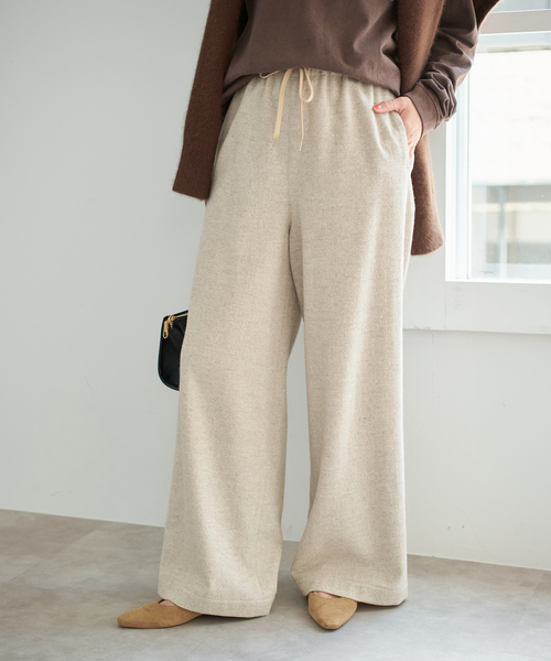 完売していたベージュが待望の追加決定!・こちらの商品は≪24030200824040≫≪25030200833040≫の追加商品です。・ベージュのみの追加です。・追加生産商品は、一部の店舗、通販で販売中の場合がございます。予めご了承下さい。・同一商品でも個体差が生じるため、採寸内容に若干の差が生じる場合がございます。・レビュー内容は、品番の異なる同商品のレビューが含まれており現在、展開外のカラー・サイズが含まれている場合がございます。シーズンムードを感じさせるツイード素材で仕立てたイージーパンツ。程よくワイドなシルエットでリラックス感がありつつ、大人っぽいバランスに仕上げました。ウエストはゴムとスピンドルのイージー仕様で、着脱やサイズ調整がしやすく快適な穿き心地です。総裏仕立てで肌当たりがよく、デイリーに安心してお使いいただけます。クラシックな雰囲気とカジュアルな要素を絶妙にミックスしたデザインは、きれいめスタイルにもカジュアルスタイルにもマッチする、幅広い着こなしに対応可能な万能アイテムです。**********************透け感:なし裏地:あり伸縮性:なし光沢感:なし生地の厚さ:普通**********************【スタッフ着用コメント】《スタッフS》20代後半/身長:156cm/普通/普段サイズ:S/着用サイズ:36サイズ感:緩やかなワイドシルエット。36サイズをハイウエストで穿いて、ギリギリ地面に着かないくらいの丈感です。素材感:秋冬にぴったりなウール混の温かみのある素材感。裏地はつるっとした素材なので穿きやすいです。着心地:ウエストがゴム仕様で紐で調整ができ、窮屈感なく楽ちんに穿けました。*********************※取り扱いについては、商品についている品質表示でご確認ください。※詳細画像のグレーは≪25030200833040≫にて予約しております。こちらの品番ではお取り扱いはございませんが、参考画像として掲載しております。※こちらの品番は、Spick & Span オンライン限定での取り扱いとなります。店舗でのお取り扱いはございませんのでご注意ください。なお、入荷店舗は予告なく変更になる場合がございます。※照明の関係により、実際よりも色味が違って見える場合があります。またパソコン・スマートフォンなどの環境により、若干製品と画像のカラーが異なる場合もございます。※商品の色味は、商品アップ画像をご参照ください。ベージュ着用スタッフ:160cm 着用サイズ:38ベージュ詳細着用スタッフ:162cm 着用サイズ:38本体:ドライクリーニング