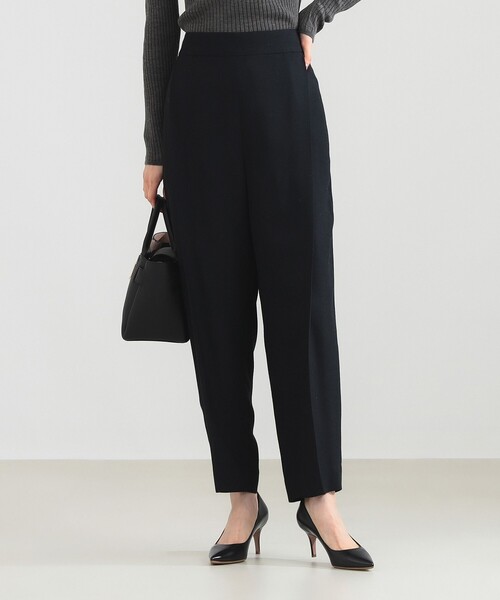 立体感のあるエレガンス ■デザイン 太めのベルトがアクセントになったハイウエストパンツ。腰位置を高く見せるデザインと、深く入れたタックがつくる陰影が立体感を生み出します。 ■コーディネート ジャケットを羽織ればオンスタイルに、フラットシューズやリラックス感のあるトップスと組み合わせれば大人カジュアルにも。ウエストデザインを活かしたタックインコーデも映える1本です。 ■ディテール 深めのタックがヒップから裾にかけて自然なボリュームを描き、気になる部分をさりげなくカバー。 ■サイズ 脇のラインにほんのりカーブを効かせることで、柔らかな女性らしい印象をプラス。程良くゆとりをもたせつつ、カーブの位置を高めに設定することで、脚をすっきりと演出します。 ■素材 ポリエステルとウールのジョーゼット素材。高密度に織り上げることで、繊細な表情と程良い落ち感を実現しています。 ■ケア方法 ドライクリーニング可(詳細は商品についている洗濯表示タグをご覧ください。) Model:H171 B80 W58 H86 Size:38 ********************** 生地の厚さ:やや薄手 透け感:なし 伸縮性:なし 光沢感:なし 裏地:あり ********************** ※光の当たり具合やパソコンなどの閲覧環境によって、実際の色味と異なって見える場合がございます。予めご了承ください。 ※商品の色味は商品単体で撮影した画像をご参照ください。